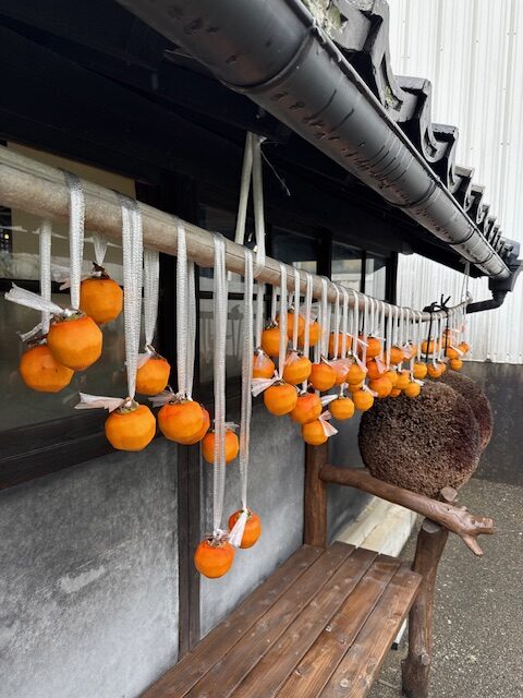 At MORIKUNI’s garden, the familiar sight of hanging persimmons has returned once again this year. The orange fruits swaying under the eaves have become a cherished symbol of autumn. This time, they were lovingly handmade and brought over by a kind neighbor—each one carefully peeled and strung up with care.