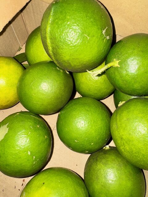 まあるく実ったレモンが、枝から地面につきそうなほどに育っています。 まだ緑のうちに収穫し、香り高いうちに輪切りにして、はちみつにじっくり漬け込みました。