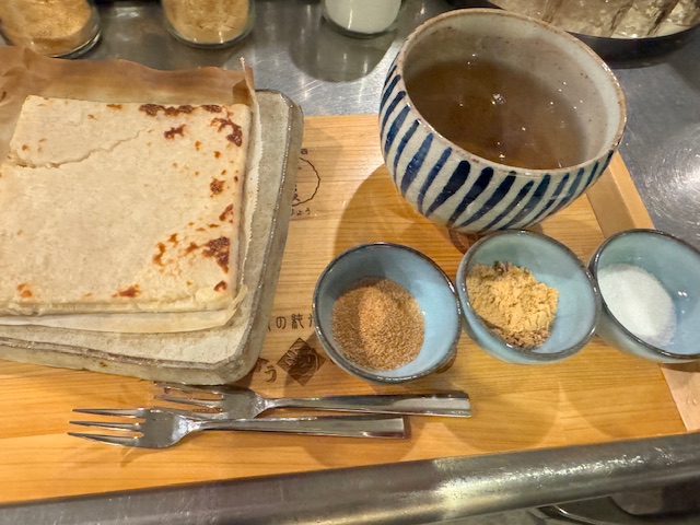 Enjoy freshly roasted sake lees served with sugar, burnt soy sauce sugar, or kinako sugar.