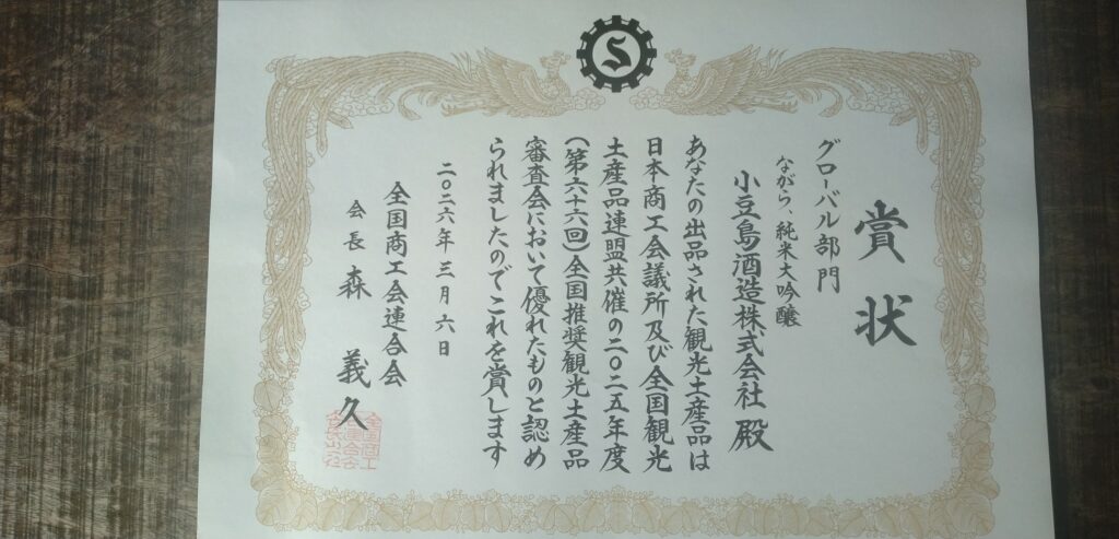 2024年度は「小豆島にオリーブの実のなるころ‥」が中国大使館賞を受賞し、今回は「ながら、」純米大吟醸がグローバル賞を頂きました。 小豆島の酵母と、地元・香川の酒米オオセトを用いて仕込んだ、小豆島にこだわったお酒が2年連続で受賞できましたことは、小豆島の酒蔵として大変うれしく、誇りに思っております。 The awardees’ networking event for the 2025 (66th) Nippon Omiyage Award (National Recommended Tourism Souvenir Competition) was held on Friday, March 6 at the Tekko Kaikan in Tokyo. However, as we were in the midst of sake brewing, we were unable to attend, and the organizers kindly sent us the certificate.